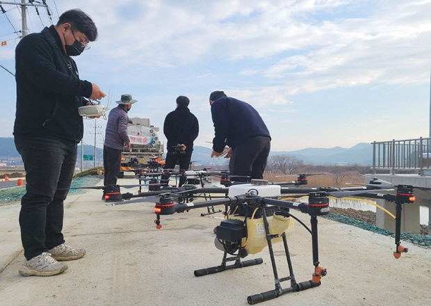 ![]() 지역 농가들이 농업용 드론을 이용해 AI 차단 방역 작업에 힘을 보태고 있다. <함평군 제공> |