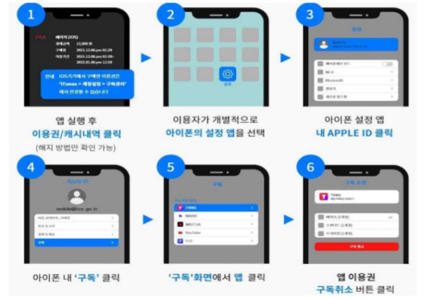 방송통신위원회(이하 방통위)는 5일 “애플 앱마켓 및 주요 구독서비스를 제공하는 모바일 앱의 인앱결제 해지절차를 점검하고 앱내 해지기능을 마련하도록 개선 권고했다”며 “애플 및 앱 개발사들은 이를 자진 시정하겠다고 밝혔다”고 발표했다.