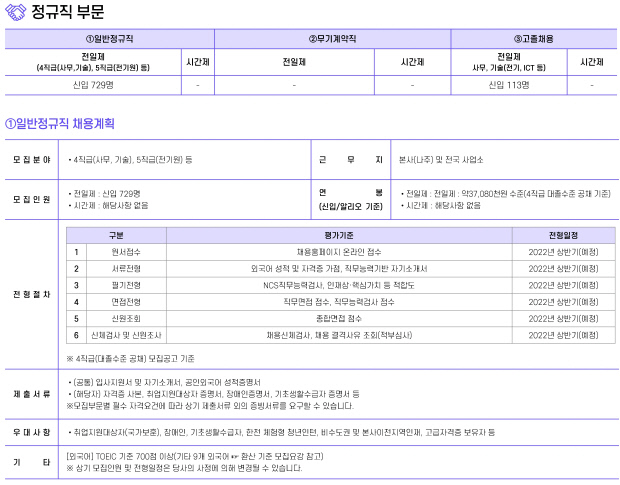 올해 일반 정규직의 경우 4직급(사무·기술)과 5직급(전기원)으로 나눠 상반기 동안 원서접수와 서류·필기·면접 전형을 치른다. 4직급 대졸수준 공채 기준 전일제 연봉은 약 3708만원 수준이다.
