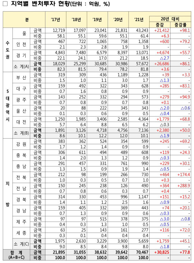 지난해 벤처투자액 7조467억원 중 서울·인천·경기 등 수도권 투자액은 5조7672억원으로 전체의 81.8%를 차지했고, 비수도권은 18.2%에 그쳤다.