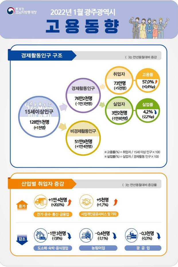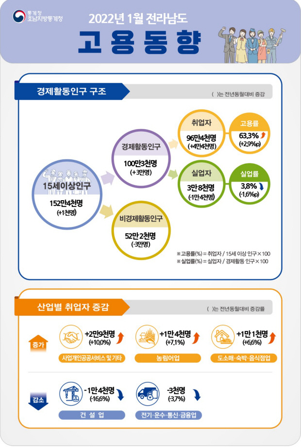 16일 호남지방통계청이 발표한 ‘2022년 1월 고용동향’에 따르면 지난달 취업자는 광주 73만명·전남 96만4000명으로, 전년 같은 달보다 각각 5000명, 4만4000명 증가했다.