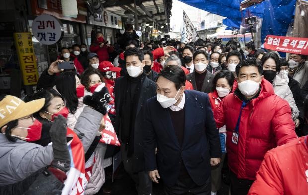 ![]() 지난 16일 광주 송정매일시장을 찾은 국민의힘 윤석열 대선후보. /최현배 기자choi@kwangju.co.kr |