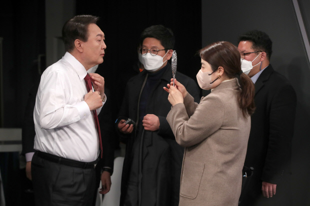 ![]() 국민의힘 윤석열 대선후보가 20일 방송광고 촬영을 위해 서울 중구 한 방송사에서 방송광고 촬영을 위한 준비를 하고 있다. 윤 후보는 이날 공개 일정을 잡지 않고 방송 광고 촬영과 토론 준비에 들어갔다. /국회사진기자단 |