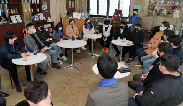 ![]() 민주당 광주시당 청년선대위원들이 22일 오후 광주 동구 한 커피숍에서 최근 복합쇼핑몰 이슈에 대한 청년창업자와 로컬크리에이터들의 여론을 청취하고 있다. /최현배 기자choi@kwangju.co.kr |