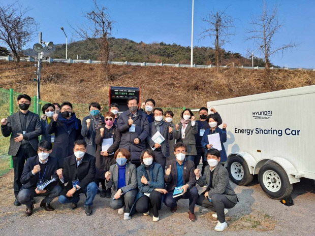 ![]() 광주시 에너지전문가·시민활동가들이 지난 25일 광주 AI-뉴딜추진위원회 주관으로 광주도심 내 에너지셰어카 서비스현장(미래형 스마트그리드 실증연구사업)을 방문해 기념촬영을 하고 있다. |