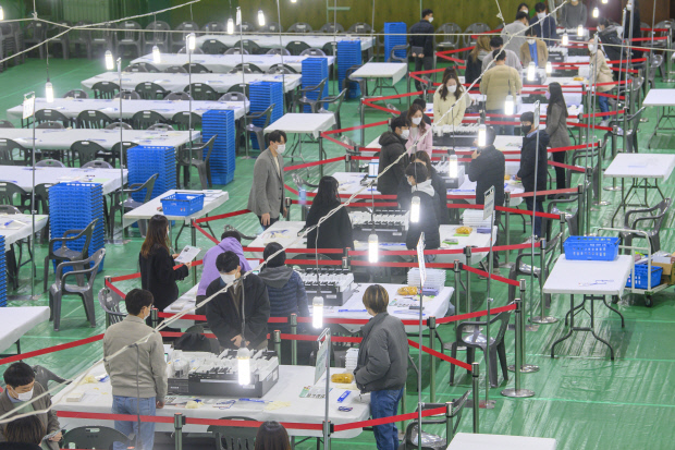 ![]() 제20대 대통령선거를 하루 앞둔 8일 광주 북구 용봉동 전남대학교 체육관에 개표소가 설치되고 있다. 개표 종사원들이 개표기기를 시연해보고 있다. /김진수 기자 jeans@kwangju.co.kr |