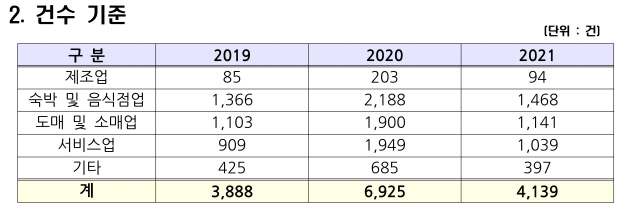 다른 업종에 비해 기술력과 시설투자 부담이 적은 숙박 및 음식점업 보증이 차지하는 비중은 2019년 35.8%(311억2800만원), 2020년 31.9%(526억3600만원), 지난해 36.6% 등으로 나타났다.