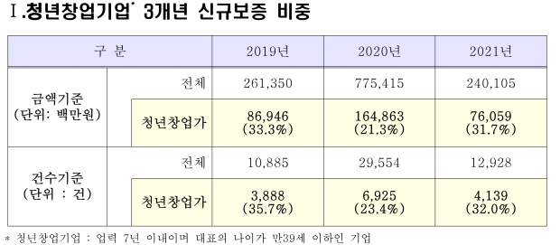 청년창업자 보증금액 비중은 지난 2019년 33.3%(2614억 중 869억)에 달했지만 2020년 21.3%(7754억 중 1649억)으로 줄어들었다. 지난해 비중은 31.7%로, 30%대 비중을 회복했다.