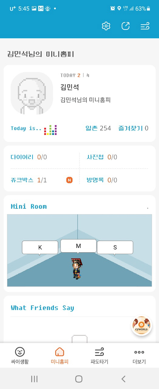 ![]() 어플 형태로 바뀐 싸이월드 내 미니홈피의 모습. |