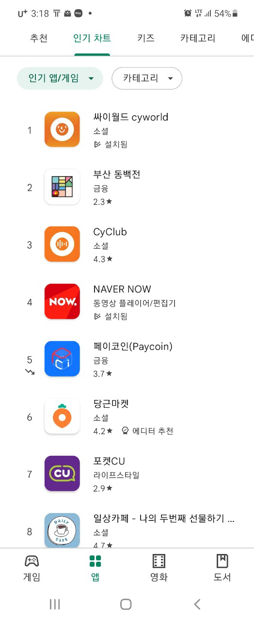 ![]() 구글 플레이스토어 어플 인기차트에서 1위에 올라있는 ‘싸이월드’ |