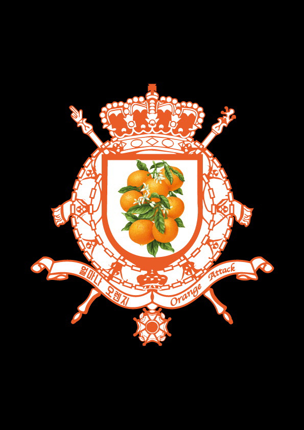 이번 전시는 갤러리로 가는 길부터 즐겁다. 4월의 숲에 자리한 전시장은 오렌지 왕국이라는 재밌는 컨셉으로 꾸몄다. 거대한 오렌지가 나무에 걸려 있고, 오렌지 왕국 문장(紋章)을 새긴 국기도 펄럭인다.