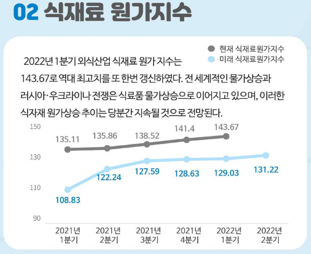 식재료 원가지수는 143.67로 지난해 4분기에 이어 또다시 역대 최고치를 경신했다. 이 지수는 전년 동기대비 식재료 원가 수준을 나타내며, 100을 넘으면 원가가 올랐다는 뜻이다.