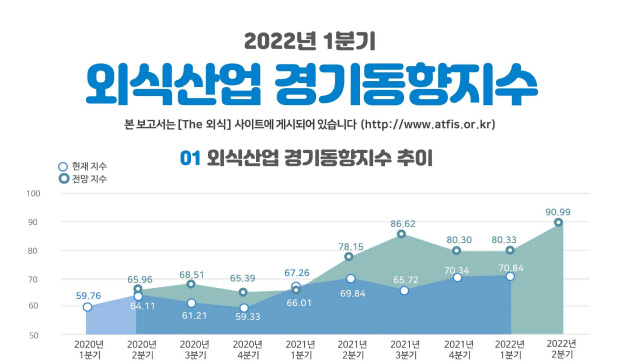 한국농수산식품유통공사(aT)가 최근 공개한 ‘2022년 1분기 외식산업 경기동향지수 보고서’에 따르면 올해 1분기 외식산업 경기지수는 70.84를 기록해 전년 4분기보다 0.50포인트 올랐다.