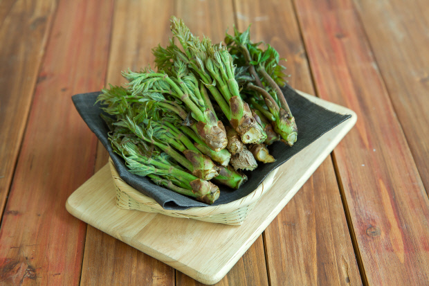 ▲두릅=두릅은 4∼5월경 줄기의 끝에서 돋아 나오는 새순을 잘라 데친 다음 초고추장에 무치거나 초고추장을 곁들여 먹는다. 김치, 튀김, 샐러드로 만들어 먹기도 한다. 두릅은 칼슘, 철분 등 무기 영양성분이 풍부하고 비타민 A, B₁, B₂, C 등이 골고루 함유된 건강 자연식품이다.