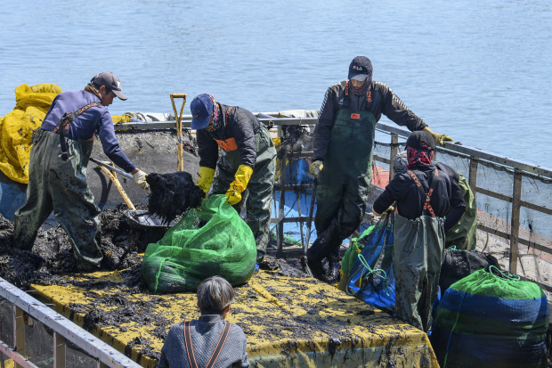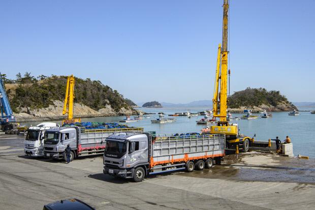 지난 3월 29일 찾은 진도 접도 수품항은 질 높은 물김을 전국 곳곳으로 실어가려는 30t 대형 트럭들로 가득했다. 출발하기 전 진도 앞바다에서 어민들이 채취한 물김에서 바닷물을 제거해야 하기 때문에 대기중이었다. 물김을 가득실은 포크레인 선박들이 쉴 새 없이 드나드는 수품항의 위판 규모는 지난해 5만5,000t(위판액 655억 원)에 달해 고흥과 함께 우리나라 물김 생산의 쌍벽을 이루고 있다.