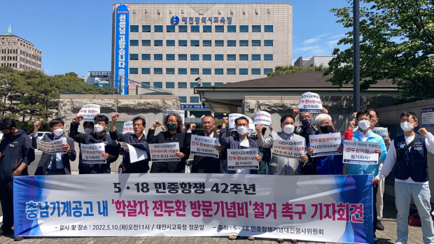 5·18민중항쟁기념 대전행사위원회는 10일 대전시교육청 앞에서 기자회견을 열고 “충남기계공고에 설치된 ‘학살자 전두환 방문 기념비’를 철거하라”고 촉구했다.