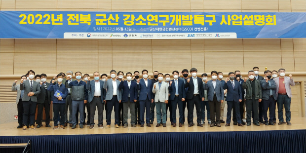 ![]() 최근 열린 ‘2022년 군산 강소연구개발특구 사업설명회’에서 참석자들이 기념촬영을 하고 있다. |