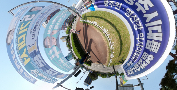 ![]() 24일 오전 광주 북구 중흥동 광주역 광장에 제8회 전국동시지방선거에 출마한 여러 후보자들의 현수막들이 붙어 있다. 360도 전체를 볼 수 있는 VR카메라로 촬영했다. /김진수 기자 jeans@kwangju.co.kr |
