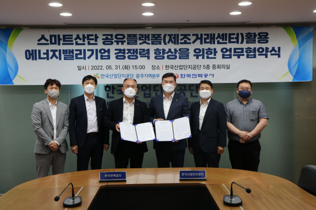 한국산업단지공단 광주지역본부와 한국전력공사는 지난 31일 ‘스마트산단 공유플랫폼(제조거래센터) 활용 에너지밸리기업 경쟁력 향상을 위한 업무협약’을 체결했다.