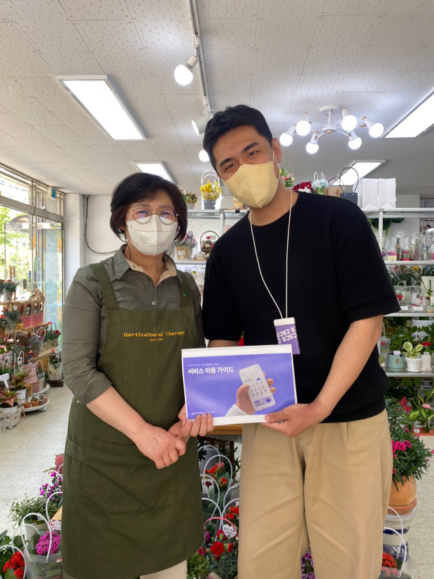 ![]() ‘두구두구’ 앱 개발자 박용범(오른쪽)씨가 서비스에 가입한 소상공인에게 설명서를 전달하고 있다.