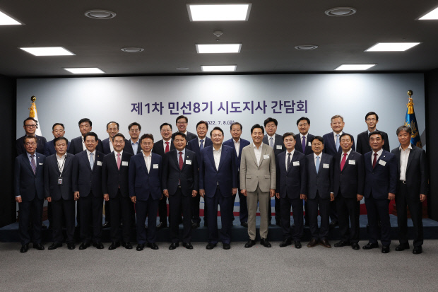 ![]() 윤석열 대통령이 지난 8일 오후 서울 용산 대통령실 청사에서 열린 제1차 민선 8기 시·도지사 간담회에 참석한 강기정 광주광역시장, 김영록 전남도지사 등 자치단체장들과 기념촬영을 하고 있다. <대통령실제공> |