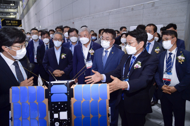 강기정 광주시장이 21일 오후 서구 김대중컨벤션센터에서 열린 ‘2022 뿌리산업전시회·그린카전시회·IoT가전로봇박람회’ 개막식에 참석해 내빈들과 전시장을 둘러보고 있다.