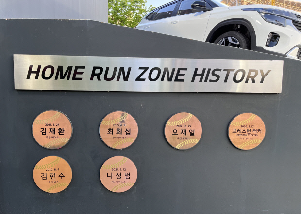 ![]() 광주-기아 챔피언스필드 외야 홈런존에 새겨진 역대 홈런 주인공. <KIA 타이거즈 제공> |