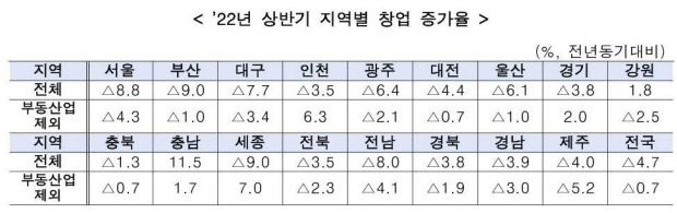 올해 창업기업이 증가한 지역은 전국 17개 시·도 가운데 충남(11.5%), 강원(1.8%) 2곳뿐이었다.