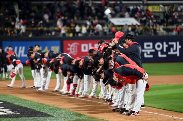 ![]() KIA 선수단이 지난 13일 KT와의 와일드카드 결정전에서 2-6패를 기록한 뒤 관중석을 향해 인사를 하고 있다. [KIA 타이거즈 제공] |