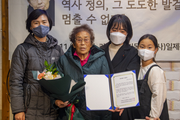 (사)일제강제동원시민모임(시민모임)은 11일 오후 2시에 광주시 서구 풍암동 한 카페에서 양금덕 할머니에게 시민들의 뜻을 모아 ‘우리들의 인권상’을 수여했다.