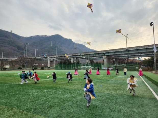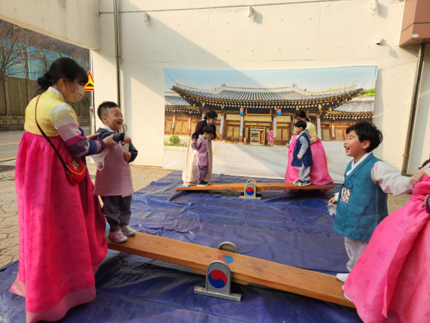 신나는 전통놀이 체험도 펼쳐졌다. 원아들은 널뛰기, 썰매타기, 연날리기, 팽이치기, 윷놀이, 투호놀이, 제기차기 등 전통 놀이를 직접 해보며 즐거운 시간을 가졌다. 특히 특히 연날리기 체험 시간에는 한 해의 소원을 담은 연을 높이 날리며 누구의 연이 더 높이 날아가는지 시합을 하기도 했다.