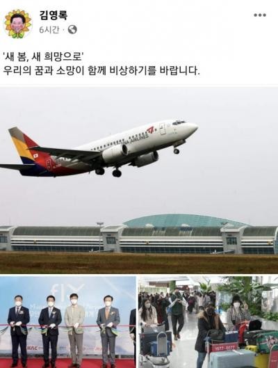 김영록 전남지사가 5일 자신의 페이스북에 무안국제공항 관련 사진과 글을 올리면서 눈길을 끌고 있다. 전남도 안팎에서는 무안공항 활성화가 시급한 현실에서 민간공항 이전 지연, 군 공항 이전 문제로 인한 지역민 반발 등 현안에 대한 고민이 담겼다는 해석이 나온다.