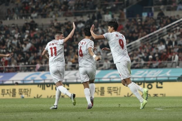 ![]() 광주FC의 허율이 9일 서울월드컵경기장에서 열린 FC서울과의 경기에서 골을 넣은 뒤 동료들과 기뻐하고 있다. <광주FC 제공> |