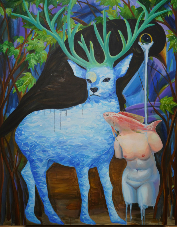 조성숙 작가의 ‘사슴섬-검은 새의 아픔’은 푸른 물결의 사슴이나 상처받은 검은 새 한 마리의 눈물을 통해 상처받지 않을 존재에 대해 이야기한다.