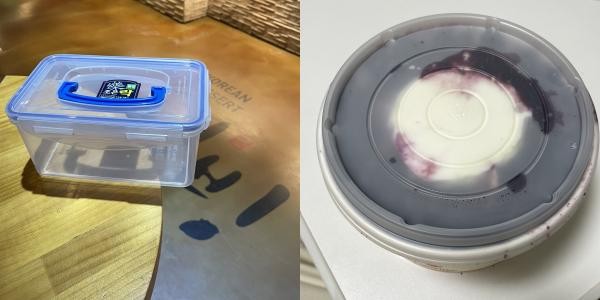 ![]() 개인 용기에 포장이 거절 당해 일회용품에 빙수를 포장해온 모습. |