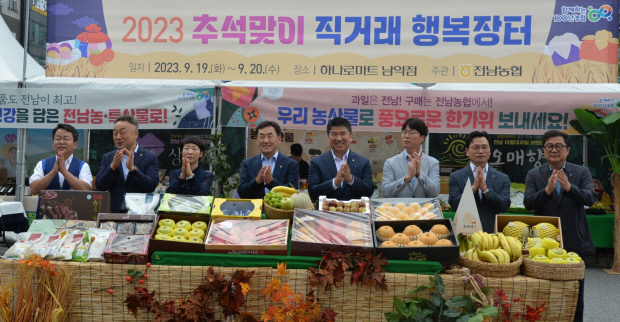 ![]() 최근 무안군 남악에서 열린 ‘추석맞이 직거래 행복장터’에서 박종탁 농협 전남본부장과 임직원들이 전남 대표 농축특산물을 홍보, 판매하고 있다. |