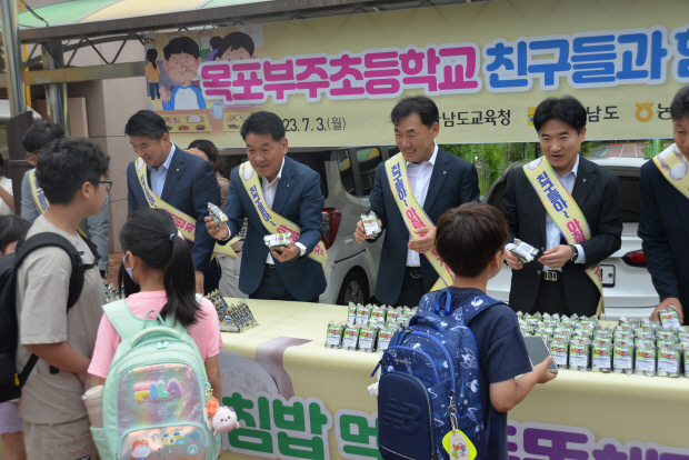 ![]() 우리쌀 소비촉진 활동의 일환으로 ‘아침밥 먹기’ 캠페인에 참여한 전남농협이 학생들에게 ‘새청무’ 쌀로 만든 삼각김밥을 나눠주고 있다. |