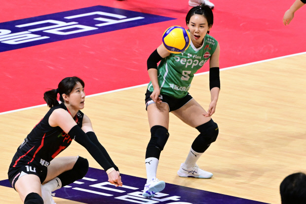 ![]() 페퍼스 박정아와 오지영이 15일 GS칼텍스와의 홈경기를 펼치고 있다. <한국배구연맹 제공> |
