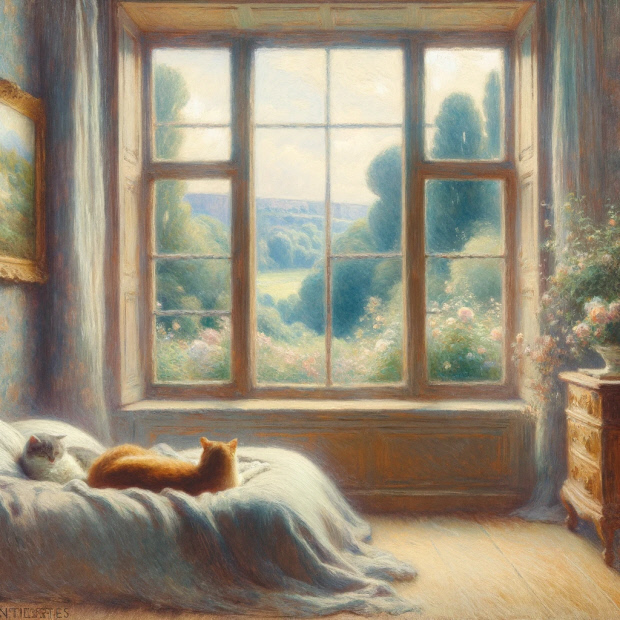 [당신] - 모네의 화풍으로 침대에 누워 창밖의 풍경을 바라보는 두 마리의 고양이를 그려줘