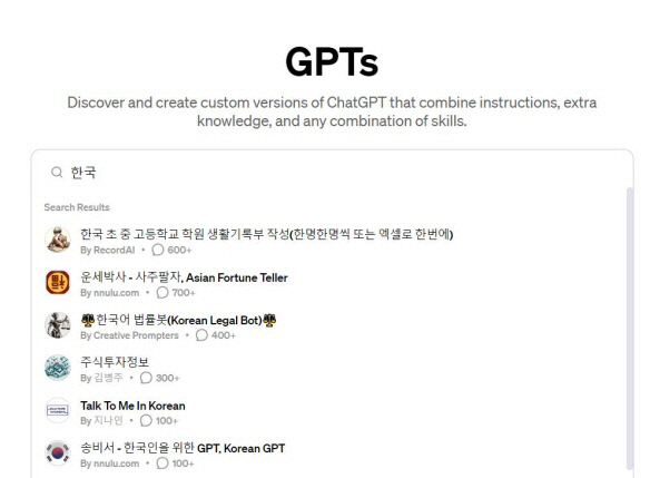 ![]() GPT스토어 내 ‘한국’ 검색 결과 |