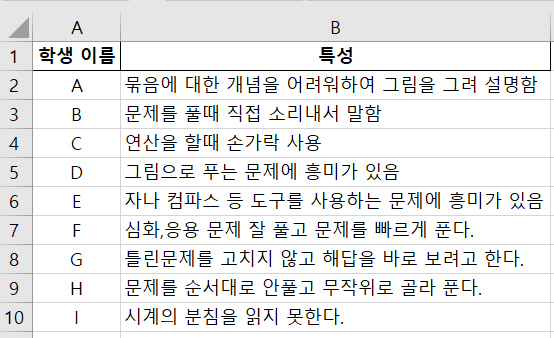 챗봇을 클릭 하니 메인에 ‘생기부 작성하기’ 버튼이 생성됐다. 버튼을 누르니 생활기록부를 한명 한명 작성할 것인지 또는 엑셀 파일로 올려 한 번에 작성할 것인지 선택할 수 있었다. 이어서 작성할 항목, 학생당 글자 수를 지정하고 나니 학생의 특성을 적을 엑셀 양식을 제공해 주었다. 챗봇을 실험해 보기 위해 양식에 맞춰 10명의 초등학교 저학년 학생들의 간단한 특성을 적어보았다.