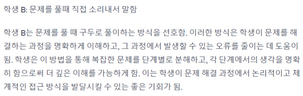 문제를 소리 내어 읽으며 풀어 같이 학습하던 학생들에게 방해가 되기도 했던 B 학생에 대해, 챗봇은 “구두로 풀이하는 방식을 선호하는 학생의 방식이 문제를 해결하는 과정을 명확하게 이해하고, 그 과정에서 발생할 수 있는 오류를 줄이는 데 도움이 된다”며 긍정적인 부분을 부각시켰다.