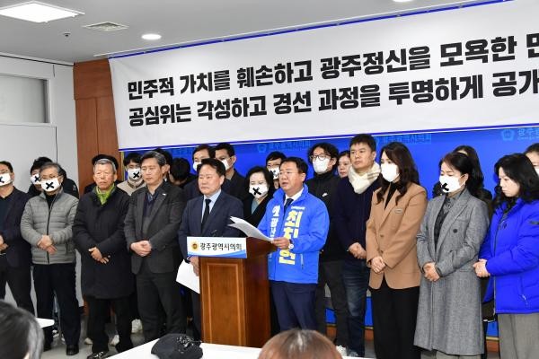 ![]() 더불어민주당 공천관리위원회의 경선 지역 발표에서 컷오프(공천 배제)된 김성진·최치현 광주 광산을 예비후보가 15일 광주시의회에서 기자회견을 열고 경선 과정을 투명하게 공개할 것을 요구하고 있다. |