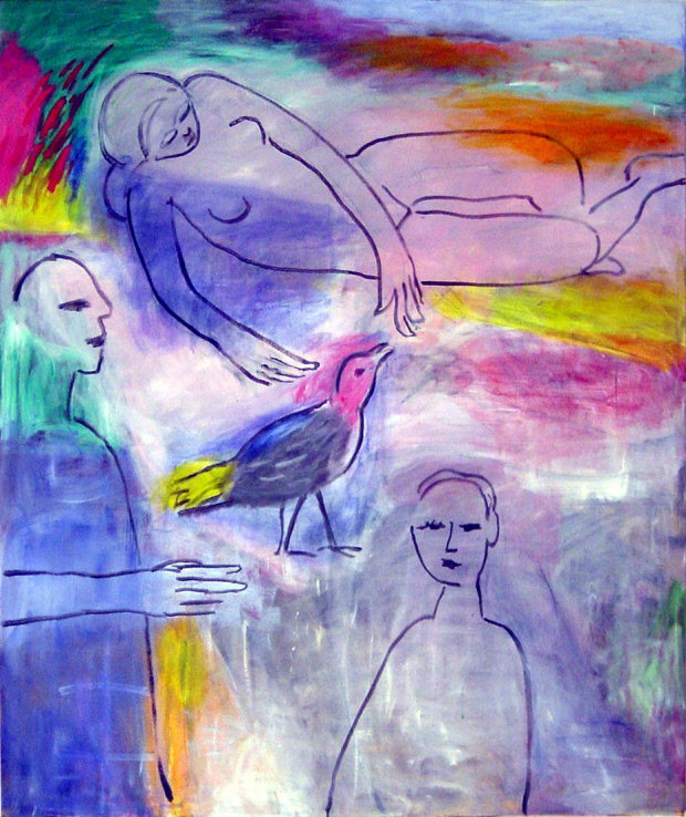 1실에서는 ‘날으는 새’와 ‘비상’을 만난다. 김 작가의 대표작 ‘날으는 새’는 다섯 명의 인물이 새를 바라보는 장면을 그린 작품이다. 특이한 것은 두 명이 거꾸로 서 있다는 점이다. 화면 오른쪽 위에는 허공을 가로지르는 새의 모습이 인장처럼 박혀 있다.