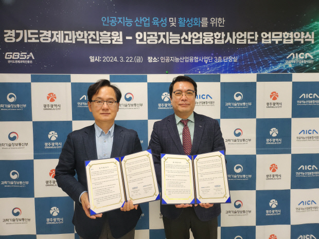 광주시 산하 인공지능산업융합사업단(AI사업단)은 지난 22일 광주시 북구 AI사업단 회의실에서 곽재도 인공지능산업융합사업단장 직무대행, 강성천 경기도경제과학진흥원장 등이 참석한 가운데 경기도경제과학진흥원과 ‘국가 인공지능 생태계 거점 조성을 위한 업무협약(MOU)’을 체결했다.