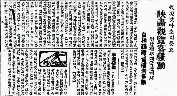 ![]() 화재 났다는 소리에 관객 소동이 발생한 제국관에 관한 신문기사. 중외일보, 1930년 3월 30일 석간 2면. |