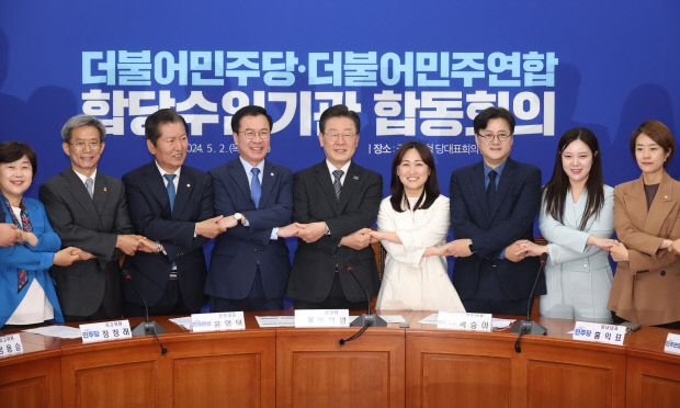 ![]() 더불어민주당 이재명 대표와 더불어민주연합 윤영덕, 백승아 공동대표 등이 2일 국회에서 열린 ‘더불어민주당-더불어민주연합 합당수임기관 합동회의’에서 손을 맞잡고 기념촬영을 하고 있다. /연합뉴스 |