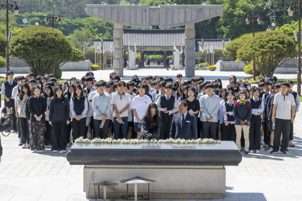 |  13일 오전 광주시 북구 운정동 5 ·18민주묘지를 찾은 화순제일중학교 학생들이 오월영령을 참배하고 있다.  /김진수 기자 jeans@kwangju.co.kr |