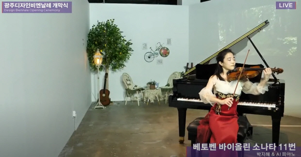 ![]() 2021년 광주디자인비엔날레 개막식에서 바이올리니스트 박지혜와 AI 피아노가‘베토벤 바이올린 소나타 11번’을 협연하고 있다. <박지혜 제공> |