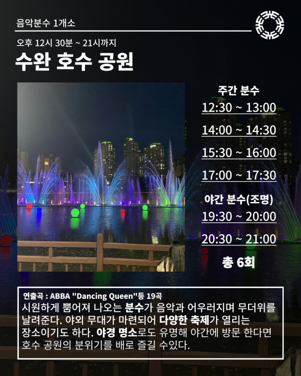 수완호수공원 음악 분수쇼는 주간에는 회당 30분씩 오후 12시 30분, 오후 2시, 오후 3시 30분, 오후 5시, 오후 7시 30분, 오후 8시 30분 등 총 6회 운영된다.